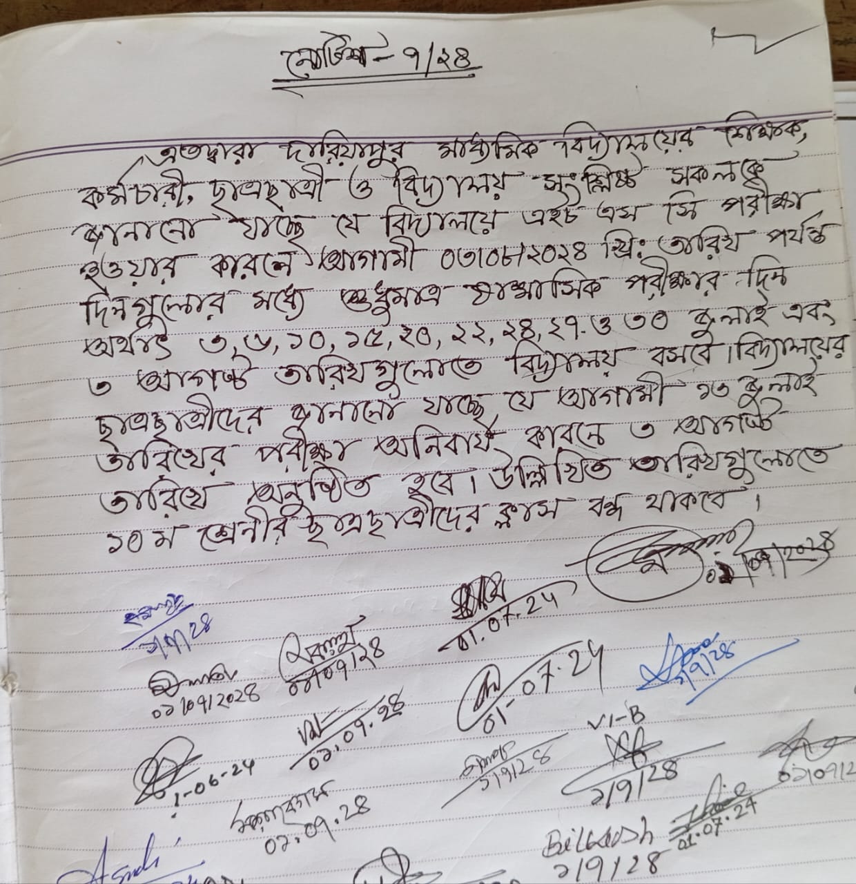 অতদ্বারাদারিয়াপুর  মাধ্যমিক বিদ্যালয়ের শিক্ষক, কর্মচারী,  ছাত্রছাত্রীও বিদ্যালয়ের সংশ্লিষ্ট সকলকে জানানো যাচ্ছে যে, বিদ্যালয়ে এইচ এস সিপরীক্ষা কেন্দ্র হওয়ার কারনে আগামী ০৩/০৮/২০২৪খ্রিঃ তারিখ পর্যন্ত দিনগুলোর মধ্যে শুধুমাত্র ষান্মাসিক পরীক্ষার দিন অর্থাৎ ৩,৬, ১০,১৫, ২০, ২২, ২৪, ২৭. ও ৩০ জুলাই এবং৩ আগষ্ট তারিখগুলোতে বিদ্যালয় বসবে। বিদ্যালয়ের ছাত্রছাত্রীদের জানানো যাচ্ছেযে আগামী ১৩ জুলাই তারিখেরপরীক্ষা অনিবার্য কারনে ৩ আগস্ট তারিখে অনুষ্ঠিত হবে। উল্লিখিত তারিখগুলোতে১০ ম শ্রেণীর ছাত্রছাত্রীদেরক্লাস বন্ধ থাকবে।